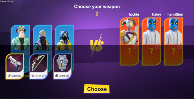 â‘¡ Click on a weapon image to select it, then click the "Choose" button to finalize your current weapon. The game match will begin once the weapon selection ends.